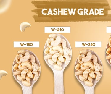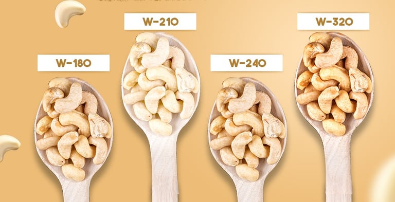 The various grades of cashew kernels, such as W180, W240, W320, W450, WS, WB,...